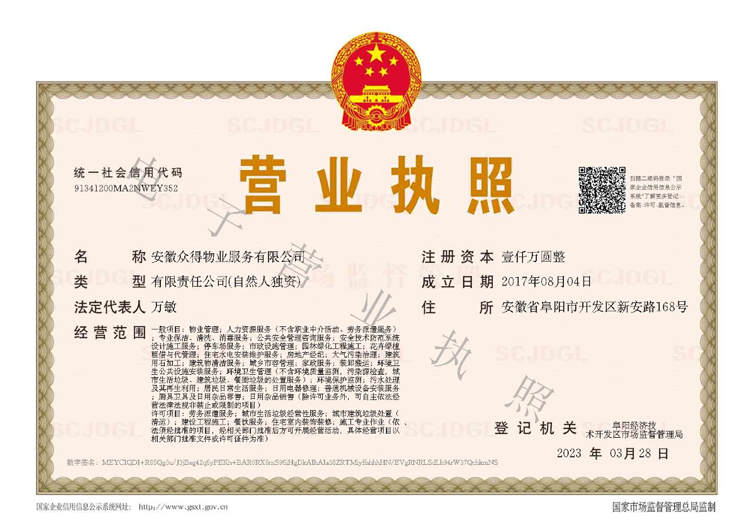 安徽眾得物業服務有限公司成立于2017年08月,注冊資金一千萬元。自公司成立以來,始終遵循“業主至上、服務第一”的企業宗旨,發揚“團結、務實、開拓、創新”的企業精神,樹立了“以人為本、人性化管理,以客為尊、讓客戶滿意”的經營理念,創立了具有眾得特色的物業服務模式。 基礎服務 保潔服務:小區保潔、單位保潔、商場保潔、醫院保潔...... 保安服務:小區保安、單位保安、商場保安、醫院保安...... ...